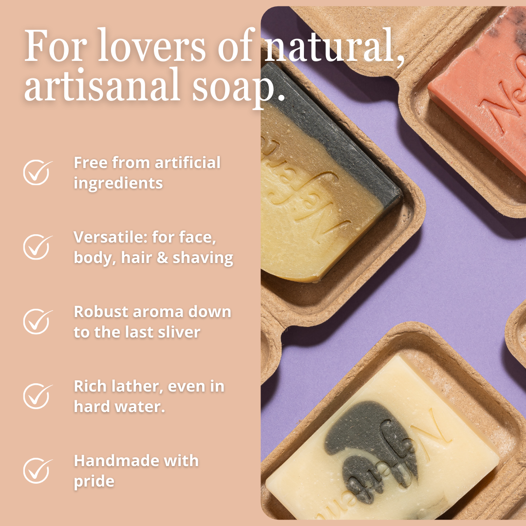 Utilizamos el doble del estándar industrial de aceites esenciales en cada barra, lo que le da a nuestros jabones un aroma poderoso y duradero.