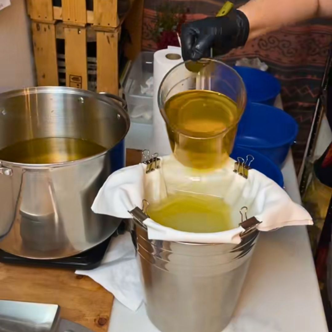 Once the liquid fat is ready, we carefully pour it through layers of natural cloth to remove the impurities.